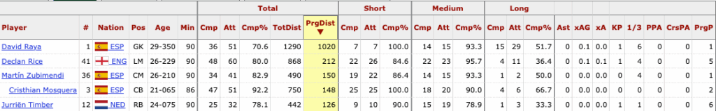 上の図はリバプールの選手、下の図はアーセナルの選手をパスの前進距離順に上位5人で並べた表なのですが、