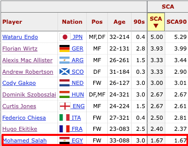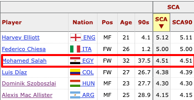こちらの表はSCA(Shot Creating Action)というシュートに繋がったアクションの90分あたりの数値をまとめたもので、上が24-25シーズン、下が25-26シーズンの数値になります。